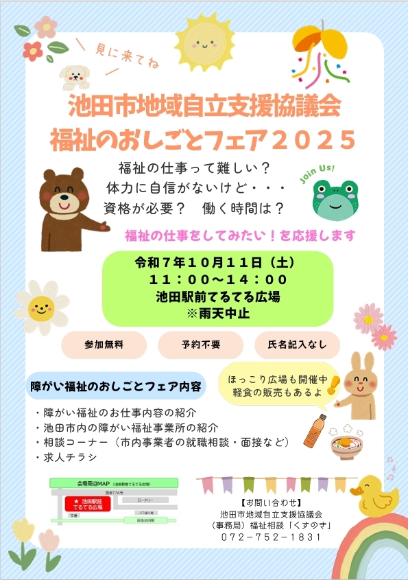 10月11日(土)11:00から、阪急池田駅前「てるてる広場」でお待ちしています!
